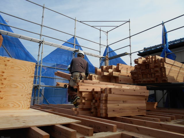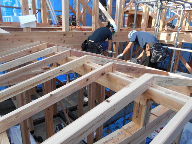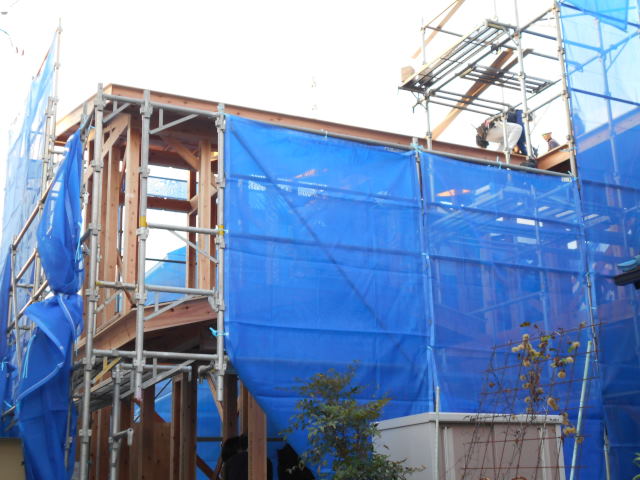 16時には屋根下地まだ完了!この後屋根屋さんに来てもらい、ルーフィング工事おこないました