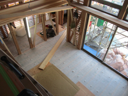 1階床の断熱工事、いつも通りパンパンにセルロースファイバーが