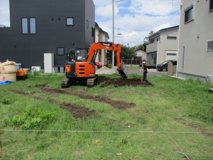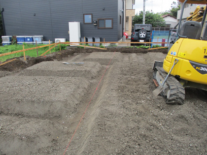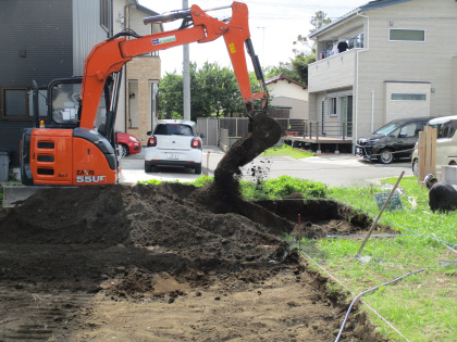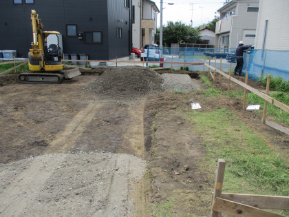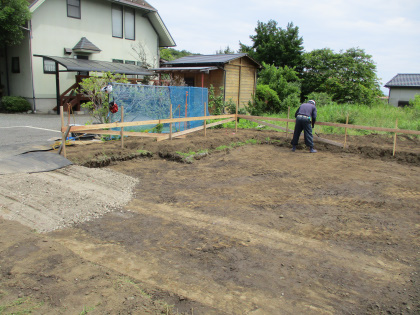基礎工事着工! 投稿日: 2021年6月23日 基礎工事の前に改良工事を行います。 今回は表層改良工事です。 重機を使用して、改良剤と土を混ぜていきます。 きれいに転圧、整地されています。 いよいよ基礎着工です。 始めにやり方(建物の位置や高さなどの基準となる作業)を出していきます。 今回は砕石で、基礎の形を造り出していきます。 段々と、基礎の形が見えてきました。