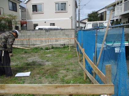 始めに、やり方(建物の位置や高さなどの基準となる作業)を