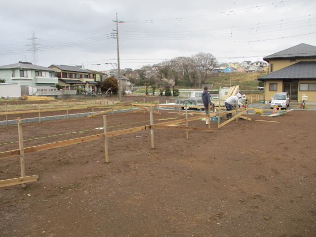基礎工事着工!! 投稿日: 2024年2月22日2024年2月22日 去年の内に、地鎮祭は滞りなく行われました。 開発のブロック積などの前に地盤改良工事も完了しています。 開発のブロックなどの工事も、きれいに完了し、いよいよ基礎着工です。 ついに基礎着工です。 やり方(建物の位置や高さなどの基準となる作業)を出しました。 無事にやり方完了しました。 もうすぐ根切り(重機を使用して地面の掘削作業)から始まります。