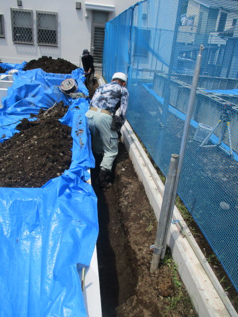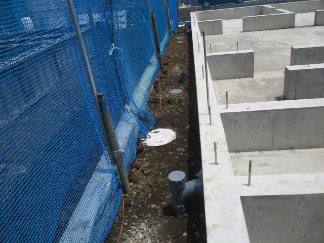 基礎完成後、外回りの先行配管の作業が始まりました。