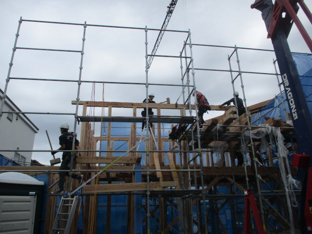 どんどん進み、棟まで上がり、垂木の作業も進んできています。