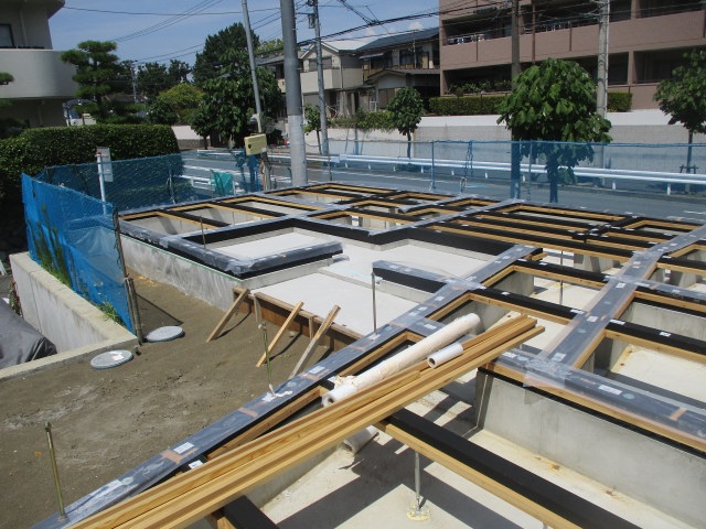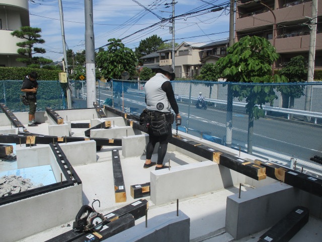 土台敷き完了! 投稿日: 2025年8月22日 ついに土台敷きです。 土台にアンカーの位置を印していきます。 アンカーの位置に穴をあけていきます。 基礎パッキンを並べ、土台を据え、今回も無事に土台敷き完了です。 先行足場も組まれました。