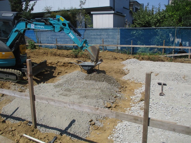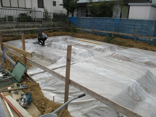 砕石敷・転圧が完了し、防湿シートが施工されました。