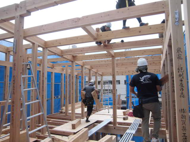 先週末 上棟しました 投稿日: 2025年9月22日 今回は1階の構造材を先に搬入 別の日に、2階の構造材搬入しました 天気が心配されましたが、降られずに上棟できました 大工さんは、野地まで完了 屋根屋さんに来てもらい、ルーフィングまで完了 上棟おめでとうございます 今後ともよろしくお願いします
