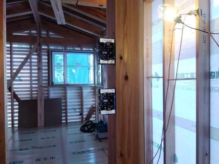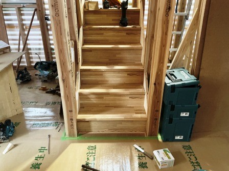 床は終わって、階段です 投稿日: 2026年1月23日 先週、だいたいの床貼り作業が終わり、 今週は階段の作業に入りました。 来週からは階段で2階に上がれます。 ありがとうございます! 先週の土曜日は電気打合せでした。 電気屋さんにボックスを設計図を元に取付けてもらって、 施主さんに位置や個数などを現場で確認していただきました。 来週は、配線作業です。 再来週には屋根と外壁と面の断熱工事があるので、 前段取りで、天井にシートが貼られました。 このシートの上と屋根の隙間が通気層になります。 週末は寒そうです。 引き続き、ご安全に。