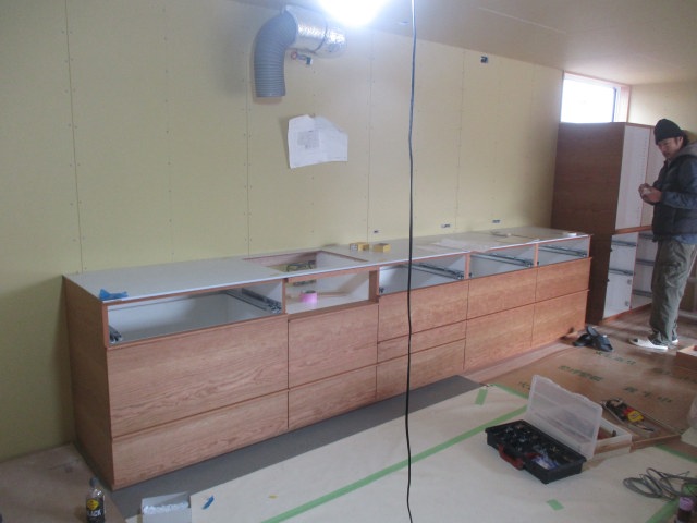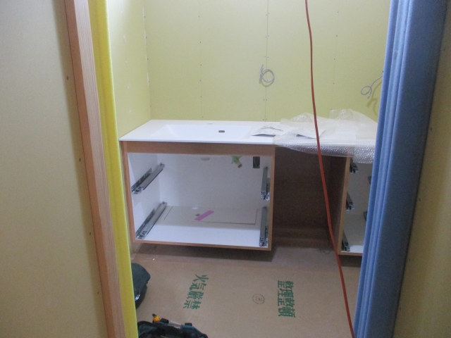 足場解体!! 投稿日: 2026年2月19日 ついに足場解体されました!! 存在感のある外観が現れました! 家具屋さん施工の洗面台が設置されました。 キッチンバックセットの家具設置も完了です。 天井クロス貼りの下地処理が進んできています。 天井クロス貼りも進んできました!