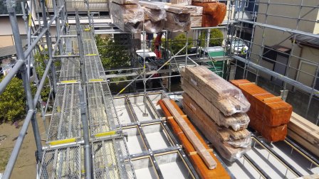 足場掛けと、上棟作業に向けた構造材を搬入しました。