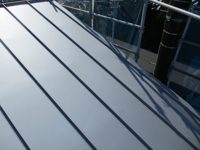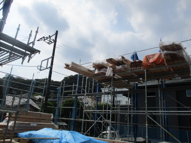 屋根のガルバリウム鋼板が搬入され、施工が始まっています。