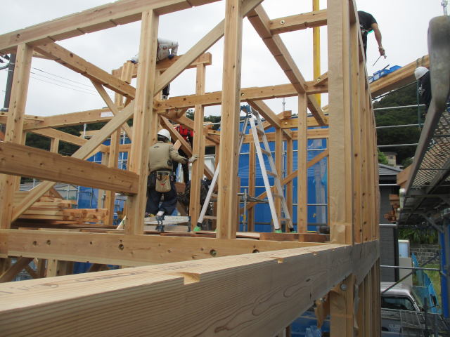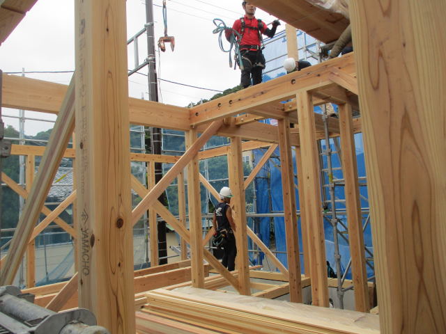 1階の柱、梁と順序良く、段取り良く、組み上げていきます。