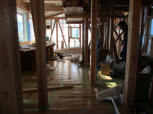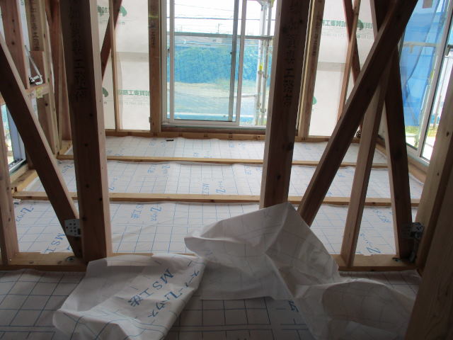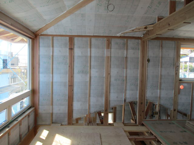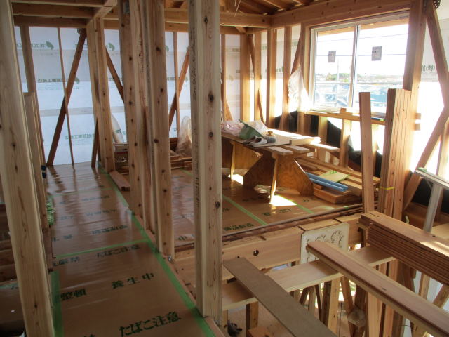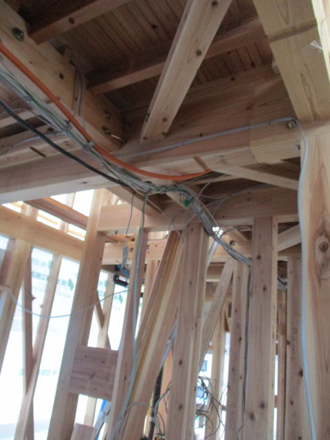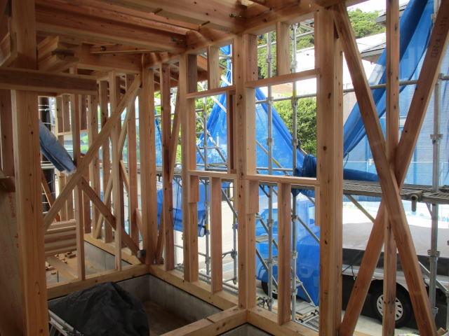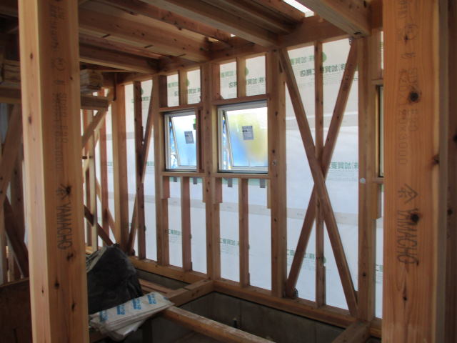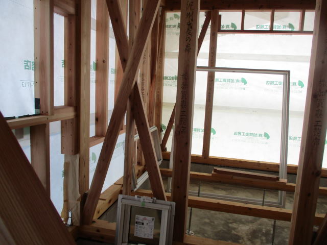 筋交い・間柱、金物などの取り付けも進み、サッシを取り付ける下地作業も進んできています。
