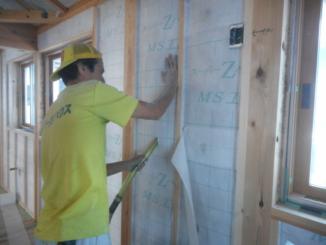 今週屋根のセルロース断熱の透湿シートの施工も行いました