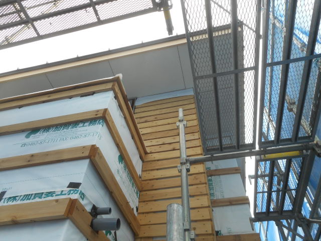 左官中塗りも終わり、大工さん外部木サイディング工事始めました