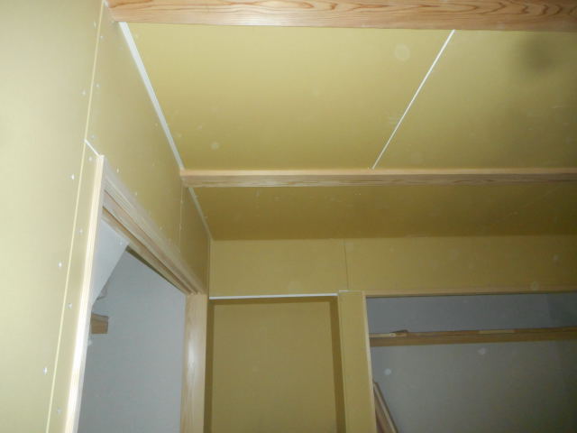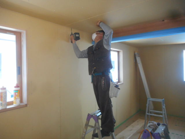 内部の方は、1,2階とも壁のボードが張れましたので、天井工事始めています