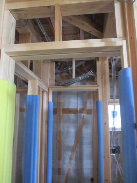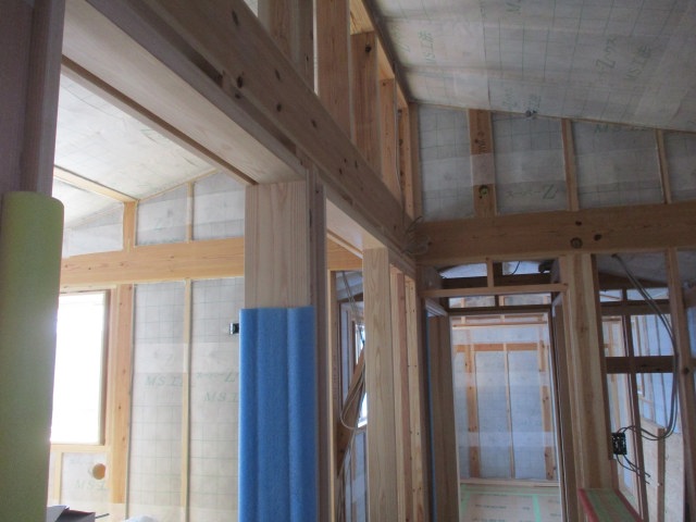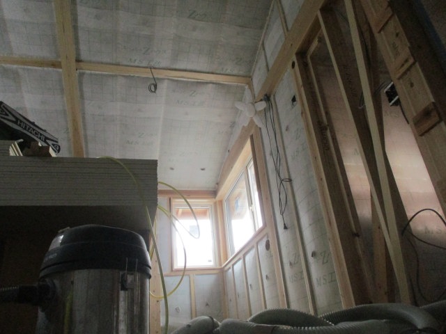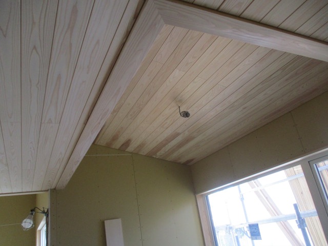 1階の天井ボード貼りも進み、天井杉板の施工も進んできています。
