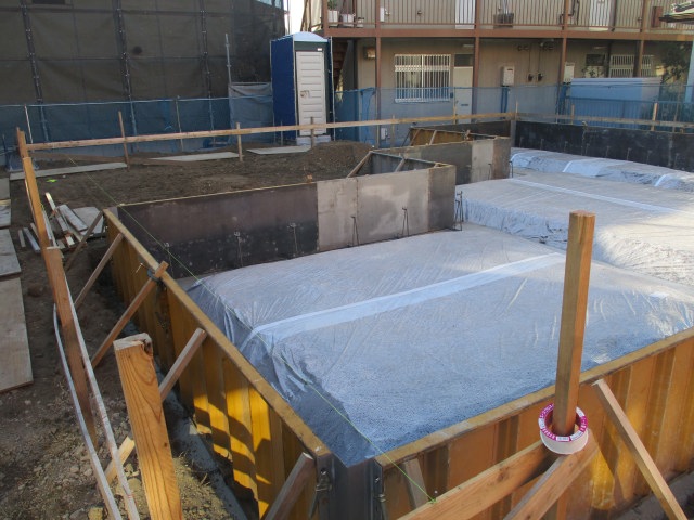 防湿シート、捨てコンなども施工され、外側の型枠も組まれました。