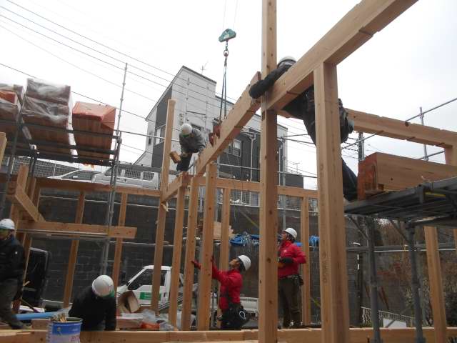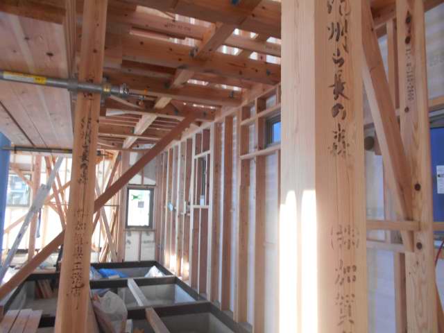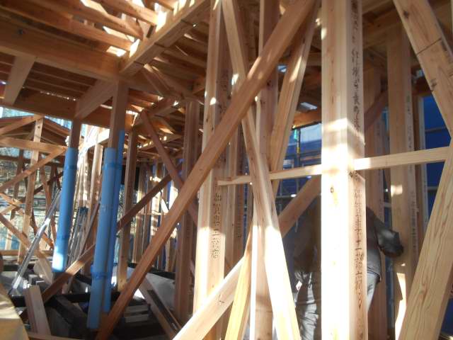 上棟後、本筋交い間柱工事を進めています