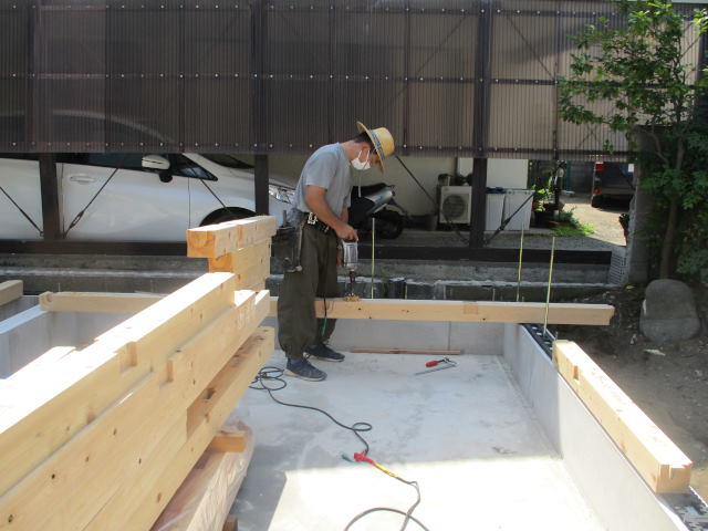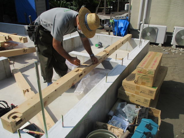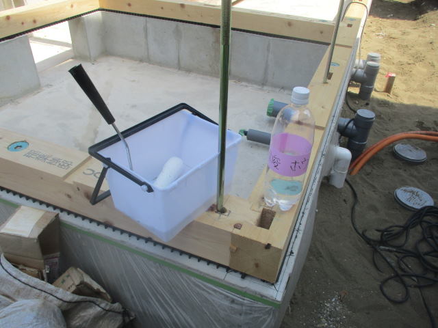 今回はホウ酸処理の現場になりますので、土台の裏を土台敷きの時に塗布しておきます。