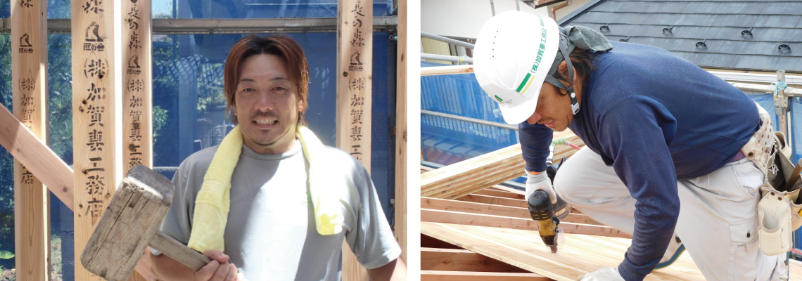 加賀妻工務店の大工はみんな仲が良いです。上棟の時など、みんなが集合し仕事をするときは、何も言わなくても、お互いに作業を進めて行けますので、とても効率が良いです。加賀妻工務店の仕事は、細かい大工仕事が多く大変ですが、造る手順や方法を自分で考えることができることが面白いです。