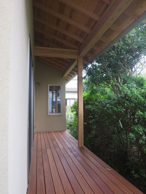 リビングから見え、デッキとお庭の緑と軒裏の杉がとてもいい雰囲気をつくっています。