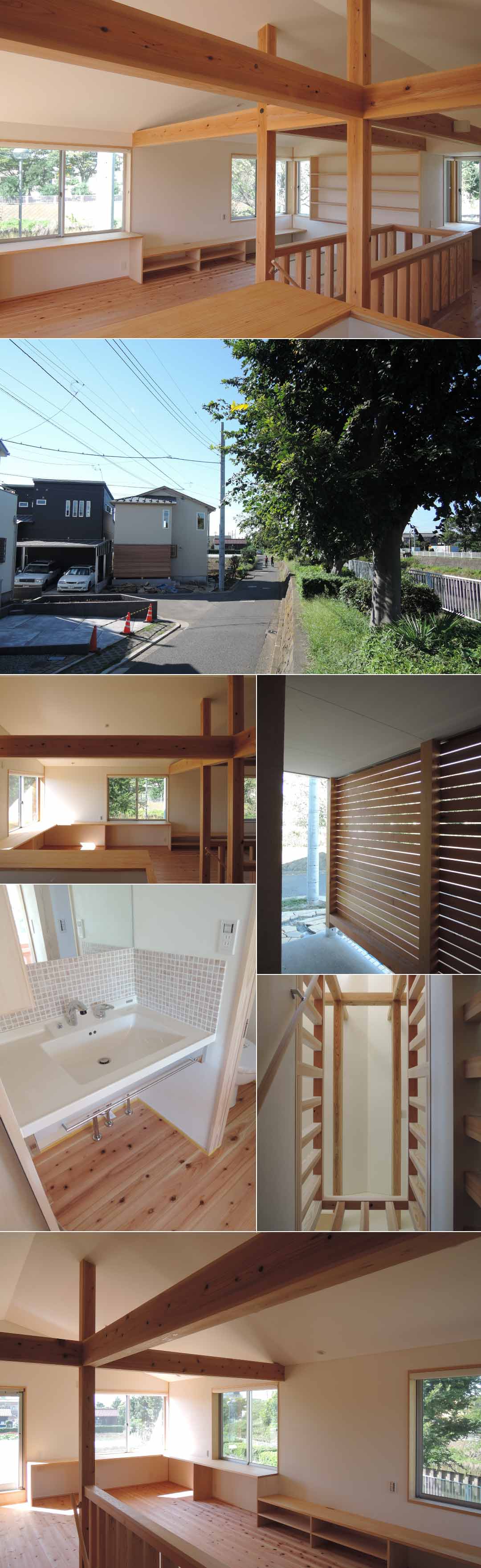 敷地周辺には南側に畑、西側に桜と川が流れ、自然が残ります。南側は将来開発の可能性もあることから、西側の桜と川沿いに2階リビングを取り、景色を取込めるような開口部を考えています。具体的には、1間幅の壁・窓・壁・窓と連続させて、壁の部分をスタディーコーナー・TVコーナーとしています。西側にはLOW-E遮熱ガラスを採用しています。 高さ制限も厳しいことから1階の天井高さを2.2mで抑えて、2階を梁を見せながら勾配天井として開放感を上げています。また1、2階共に階段廻りを回遊できるプランとして家内を広く感じるようにしています。