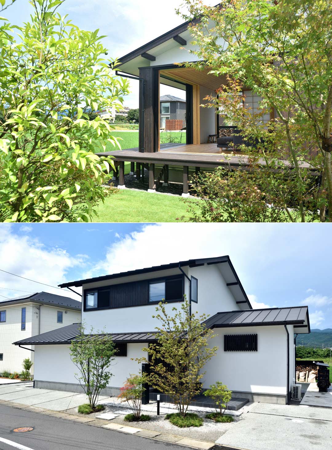 また、プロジェクターを投影する白い壁も計画しました。大屋根の両サイドに、平屋の水回り・寝室を張り出しています。アプローチは平屋の屋根を繋げて、招き入れるような形とし、植栽と踏石で演出しています。居間の開口部は障子・サッシを全開放出来るようにして、舞台のようなデッキ・田園へとつながります。2階は将来間仕切れるようにオープンな空間に仕上げています。