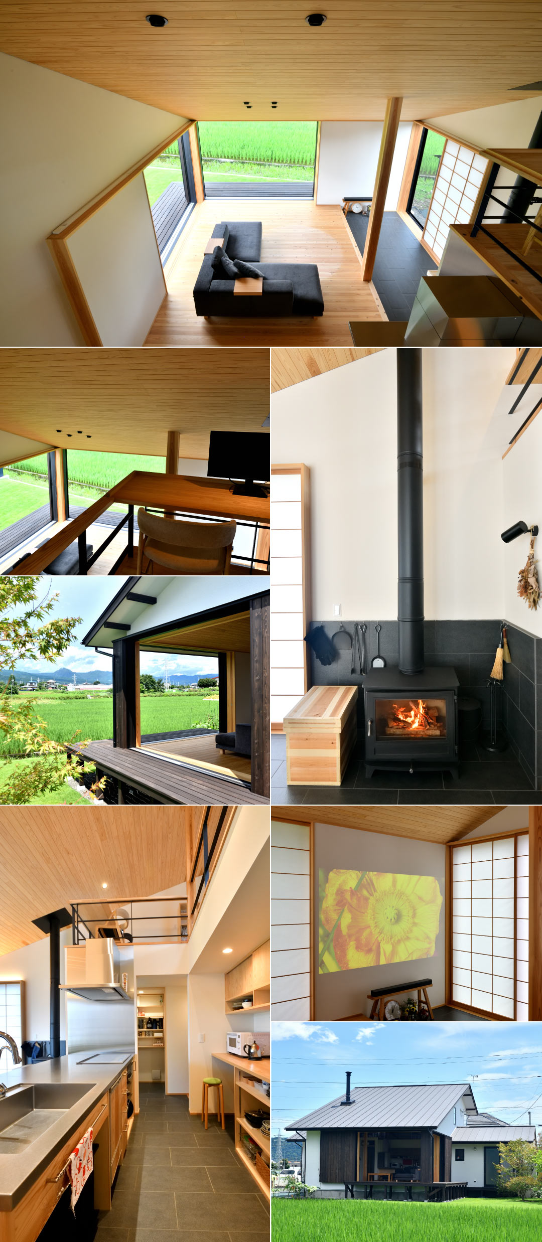小田原の田園地区の住まいです。敷地西側には富士山が望め、田園が広がります。計画としては、眺望を最大限に生かすこと、土間のある薪ストーブの住まいが求められました。建築面積の関係で平屋にはなりませんでしたが、小さな2階を大屋根の中に配置しました。切妻の大屋根を西日から守るように下ろし、その屋根の下に一段上がる居間と、全開放サッシでつながるウッドデッキ、土間の薪ストーブコーナー、ダイニングキッチンを配置しています。