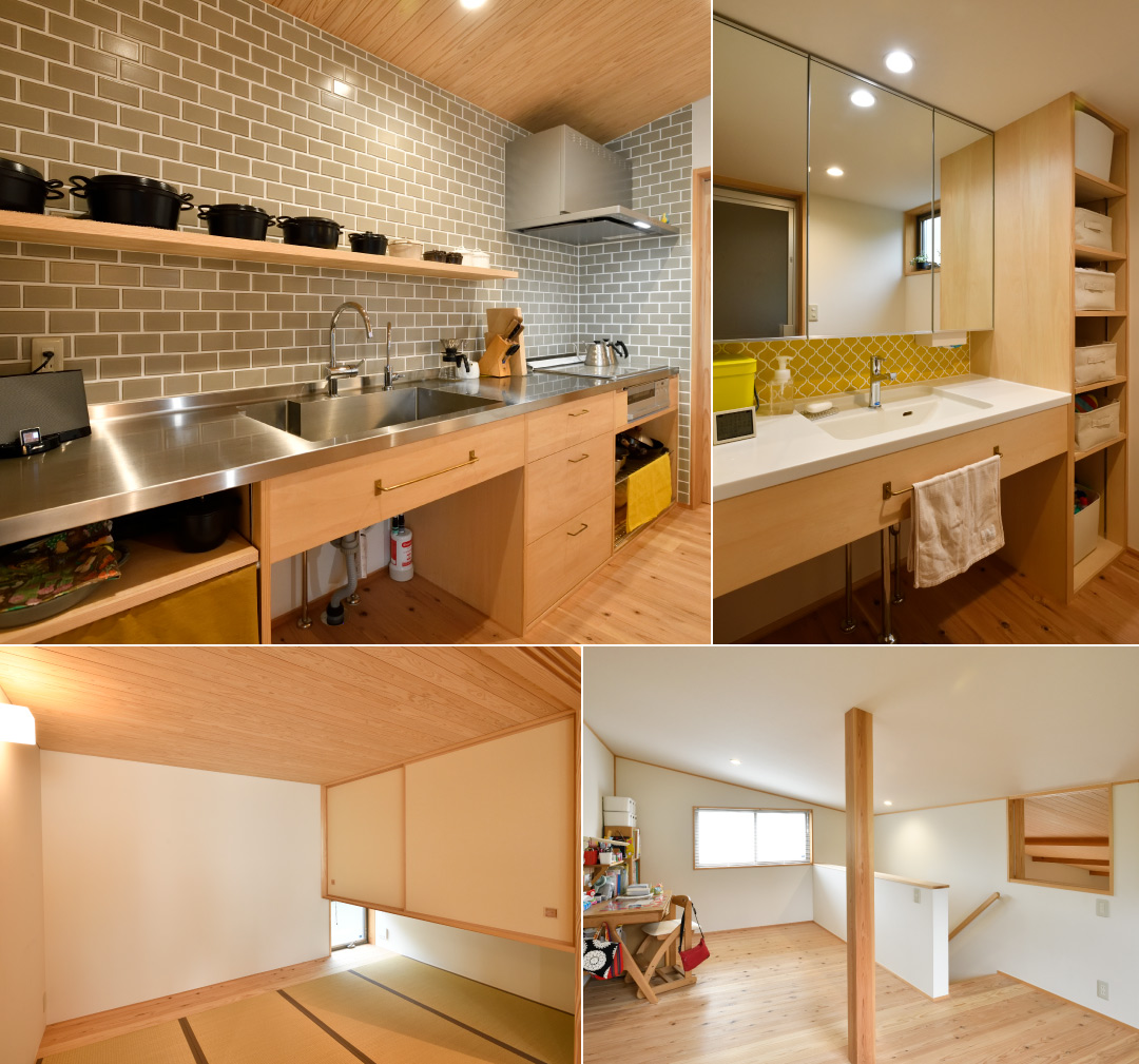 平屋風の片流れの住まいです。アプローチ側の屋根を極力低く抑えて小さな建物に見せています。そこから、西に向かって緩い屋根勾配で段々と天井高さを高くして、2階の子供室につながります。低い天井部分はキッチンでパントリー付きです。キッチンからダイニング・リビングは杉板張りの天井と共に一体空間です。リビングには幅2間の大開口に戸袋付きの障子を用意しています。襖で仕切れる、吊り押入付きの5帖の畳室がリビングにまたつながります。