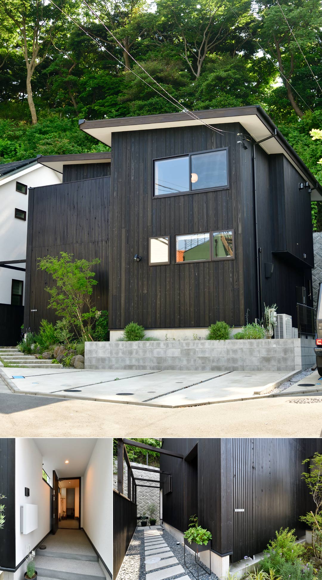 敷地は鎌倉市津にあります。7区画ほどの開発地に建ちます。選ばれた敷地は、南側に引込み道路があり、北側は森に囲まれています。北側の森が一段上がっているのと、南側はアプローチと駐車場になりそうなので、2階リビングとし、南側の道路側の抜けと、北側の森への抜けを意識したプランニングになりました。