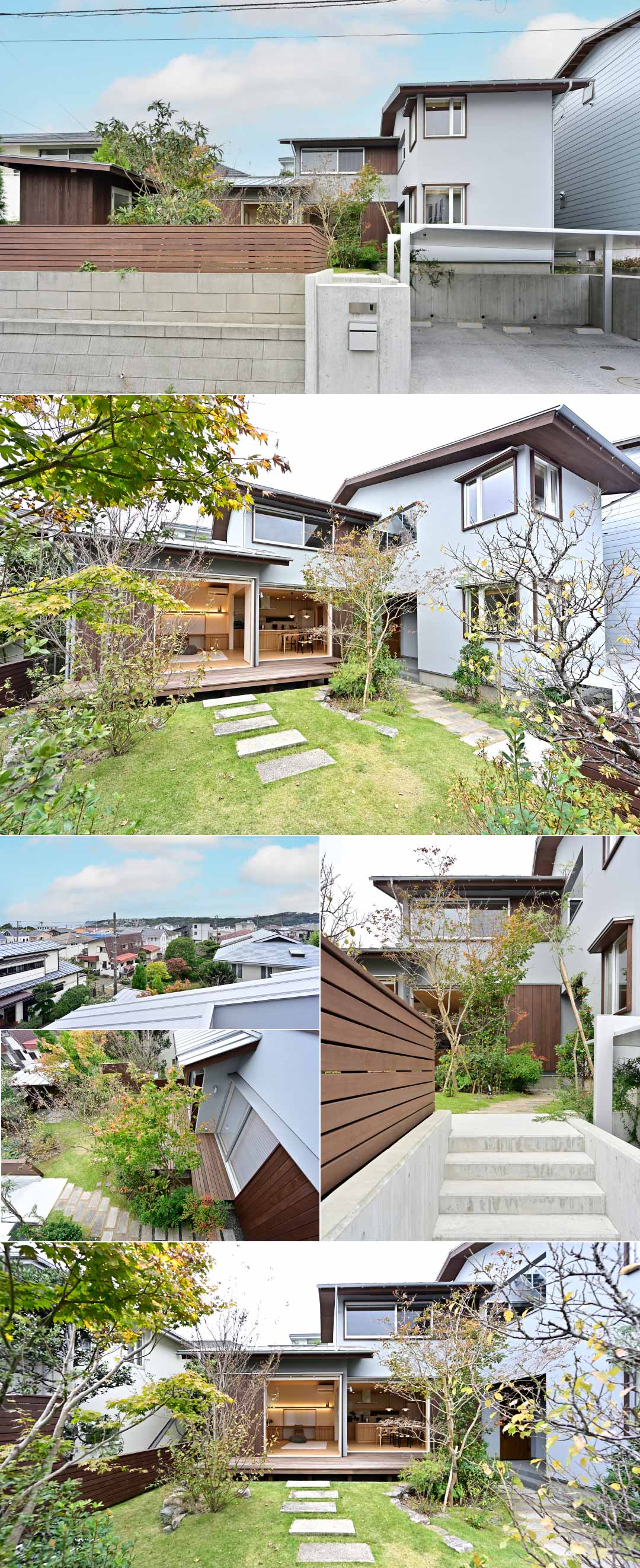 敷地は、鎌倉市七里ガ浜の静かな住宅地にあります。建物の配置は、既存駐車場・眺望の方向・ご要望・隣地との関係から、南西に庭を、東側に玄関・在宅ワーク室・バルコニーを張り出した、L字型のプランとしました。
