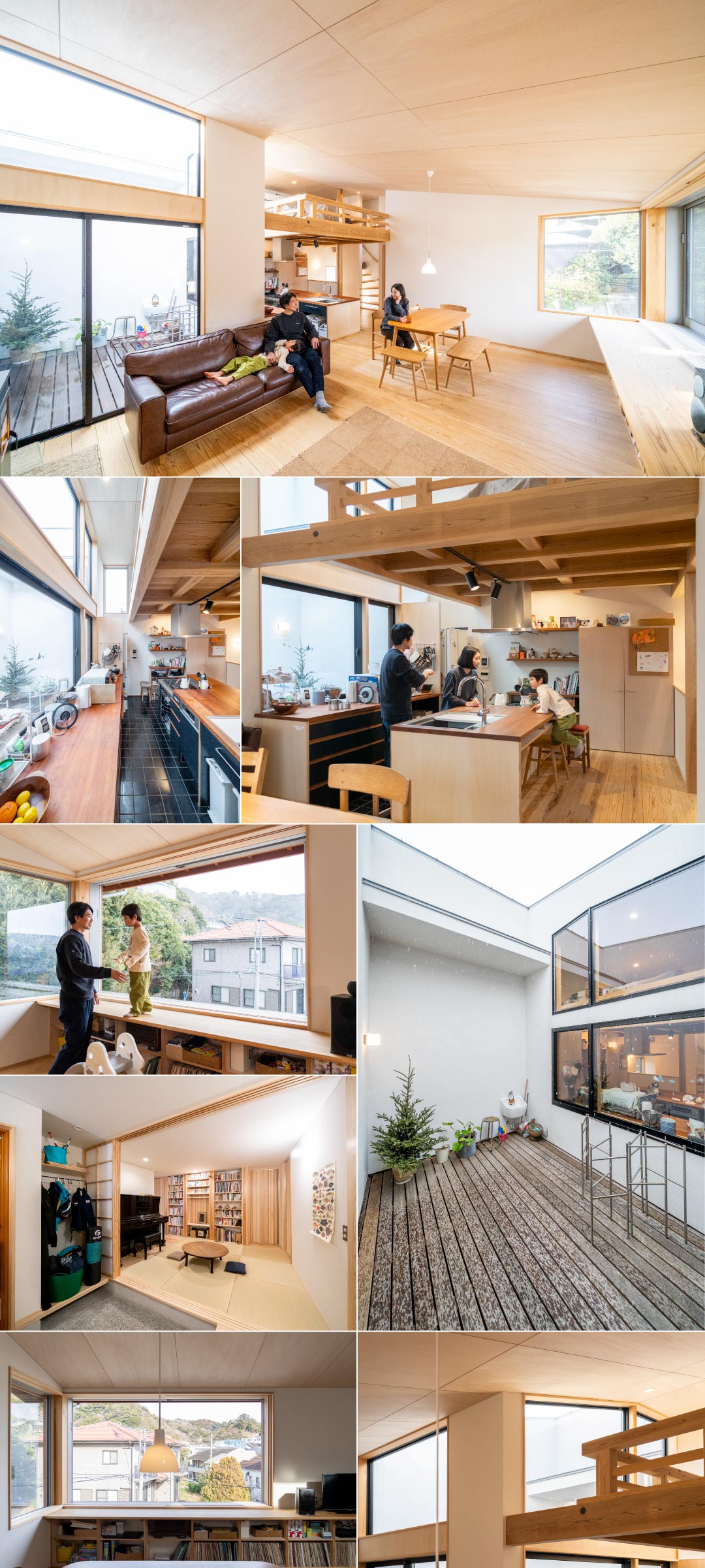 外観は、ロフトが必要なことから、比較的緩めの片流れの屋根とし、但し玄関部分を引っ込めて軒を出し、単調にならないようにしました。それぞれの開口部の数や位置を出来るだけ抑えて、効果的な光を取り入れられるように工夫しています。内部は、1階の見どころは、お出迎えの畳玄関(兼フリースペース)。2階の見どころは、ロフトへつながるシナ合板の天井、1段下がったタイル床の造作キッチンとパティオ(中庭バルコニー)です。今回、殆ど全ての家具や設備が造作家具となっており、大工工事の見どころが満載です。