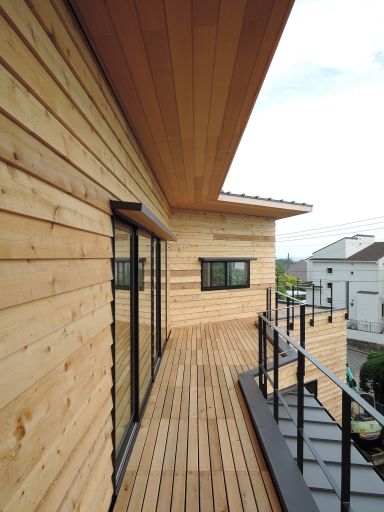 白い外壁に、サッシまわりに木を張り外観のアクセントとしました。