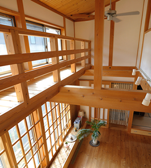 | 大藤さんの住まいは、太陽熱と空気を利用して床暖房や換気、給湯を行うOMソーラーの家。「いとこが実際に建てたということもあって、OMソーラーについては家づくりのずっと以前から注目していました」。 その快適さは、OMソーラーの家に住み始めてすぐ、ご自身でも実感するところとなりました。真冬の朝も、室内の温度は18℃。柔らかく、暖かい無垢材の床の効果もあり、スリッパをはく習慣がなくなりました。 リビング上部は大きな吹抜け、引戸の仕切りは基本的に一年中開けっ放し。「暖かさのバリアフリー」OMソーラーだから実現できることでした。「トイレなどで廊下に出る時に、以前ならば何か上に羽織るものが必要でしたが、今は必要ありません。エアコンを使うこともほとんどなくなりました」。 |