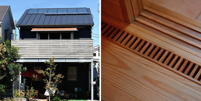 | 「エアコンに頼らない生活がしたかった」という礒野さんが、家を建てるにあたり注目したのがOMソーラーでした。局所だけをあたためるのではなく、太陽熱を床下に蓄熱し、床暖房で家全体を自然にあたためるというシステムに興味を覚えたといいます。「おかげさまで、エアコンはほとんど使うことがなくなりました。 冬、外から帰ってきて家があたたかいというのは本当に嬉しい。陽当たりがよくない1階もポカポカです」と奥さま。さらに嬉しかったのは、夏場の効果だったといいます。OMソーラーの吹出し口から涼しい風が出てきて、猛暑の時期もエアコンいらず。水まわりの湿気も抑えてくれるそうです。「『真夏でも涼しい』とは聞いていましたが、まさかと思って信じていなかったのでビックリ(笑)。太陽熱で給湯できるから、夏場はお風呂を焚くこともなくなりました」。 |