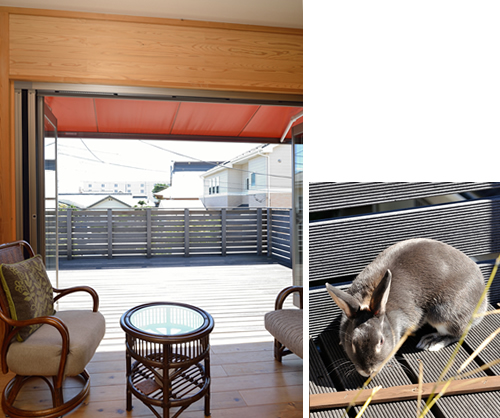 | 「決して広い家ではないので、廊下などの無駄なスペースはいらない」というご夫妻の希望から、1階は寝室と水まわり、2階はLDKのみ、というシンプルさ。仕切りのないオープンな空間は、面積以上の開放感が漂います。床だけでなく壁にも無垢の木をふんだんに使った住まいは、まるで自然の中のログハウスのよう。広々とした2階のバルコニーでは、BBQなどの食事を楽しむほか、お風呂上がりに夕涼みをしたり、ブランケットを広げて月見をしたりと、風流に活用しているそうです。「イメージしていた以上の家ができて、本当に満足しています。加賀妻さんは『できません』とは言わないので、こちらも希望を言いたい放題(笑)。かなり細かいところまで口を出させていただきましたが、すべて叶えてくださいました。それもプロの技術があってこそですよね」。 |
