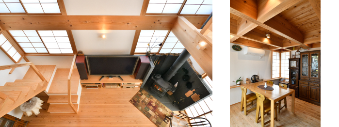 | 住まいへ入ると、出迎えてくれるのは吹き抜けの開放的なリビング。天井付近までのびる大きな窓から射し込む光が、家中を明るく包みます。シンメトリーに並ぶ窓の障子は加賀妻工務店からの提案。閉じた時のデザインの美しさもさることながら、「夏の暑さ、冬の寒さを思った以上に障子がシャットアウトしてくれるんです。温度管理までできるなんて嬉しい驚きでした。日本の家ってすごいですよね」とご主人は笑みを浮かべます。床や天井には温もりのある杉を使い、壁は漆喰仕上げに。キッチン・ダイニングの上部は若林さんの希望により、縦横に連なる杉材の梁をそのまま見せました。部屋のアンティーク家具とも美しく馴染んでいます。 |