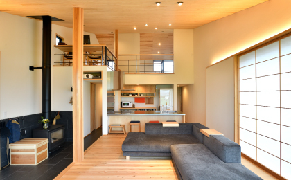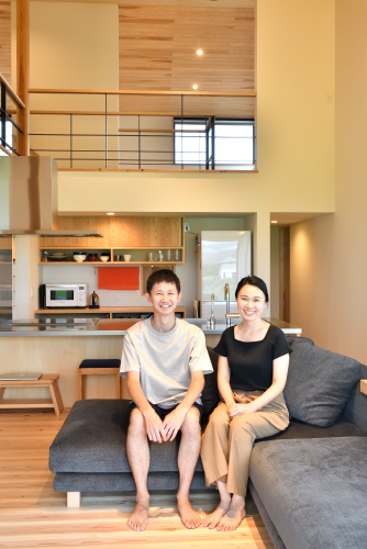 | 当初からご夫妻は、地場の工務店に家づくりをお願いしたいという希望がありました。雑誌やネットで加賀妻工務店を知り、見学会に参加。実際にいくつも家を見たことで、ふんだんに木を使った加賀妻の家に魅せられたといいます。「見学会で見た家の『いいな』と思ったところを、わが家にも取り入れてもらいました。設計士さんと話していてもお互いの認識にズレがなく、こちらのイメージをきちんと理解した上でもっと良い提案をしてくれる。要望を言いやすく、柔軟に対応してもらえるのが嬉しかったですね」。そうして完成したのは、自然素材に包まれた開放感あふれる住まい。中心となるリビング・ダイニングでは、ご主人こだわりの薪ストーブが存在感を放っています。薪をくべながら揺らめく炎を眺めるのは、冬のお気に入りのひと時。一度火を入れると2階まで温かく、ほとんど暖房を使わずに過ごすことができたといいます。 |