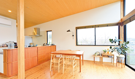 | 空を身近に感じる二宮の丘の上。美しい山並みの風景をぐるりと見晴らすように、松﨑さんご夫妻の住まいは建っています。 暮らしの中心となる2階のリビング・ダイニングは、眺めの良い北東に向かって緩やかに高くなっていく傾斜天井の大空間。最大約3.5mの高さがあり、壁一面に設けられた窓が外の景色をのびやかに取り込みます。 |