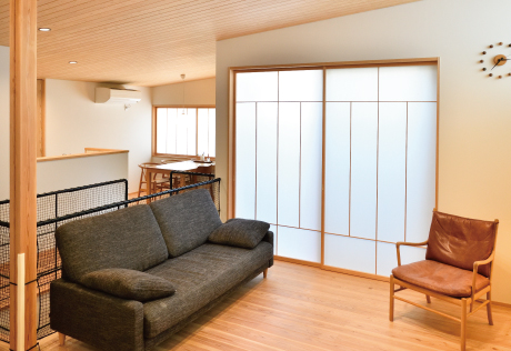 | 加賀妻工務店に決めた理由は他にもありました。「見学会で訪問させていただいた家がどれも印象的で。デザインが素敵だし、何より暮らしやすそう。木のにおい、床を歩いた感触も気持ちよく、良い素材を使って丁寧につくっているんだなと好感を持ちました」。 完成した家では裸足で過ごすことが多いという叶井さんご家族。床や天井は杉、壁は調湿効果のある漆喰で仕上げられています。「鎌倉は湿度が高いと聞いていたのですが、梅雨時期もカラッと快適。風通しも抜群です。窓は障子戸にしたところ、こちらからお願いせずとも、設計士さんがスッキリ収納できる戸袋をしつらえてくれました。細かい点まで気を配り、美しさを追求する、プロのプライドを感じましたね」。 |