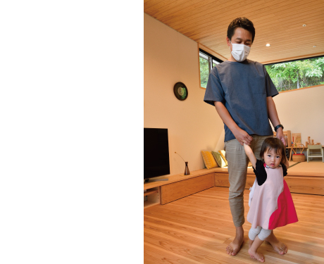 家づくりを進めているさなかに長女・いろはちゃんが誕生。近隣のファミリーとBBQをしたり、家族で江の島まで散歩したり、新居を拠点に鎌倉での暮らしを満喫されています。思いがけず活躍しているのは、リビングとダイニングの双方からフラットで繋がる3畳程度のウッドデッキ。洗濯物を干すだけでなく、燻製料理のスモークやテレワークなどに活用しているといいます。「そこまで広くないのが、かえって落ち着くんですよね。格子の目隠しがあるので、外からの目線も気になりません。ちょっとした隠れ家感覚で使っています」。 もうすぐ、2人目のお子さまも家族の仲間入り(取材時)。こだわりが詰まった住まいで、ますます暮らしの楽しみが広がります。 |