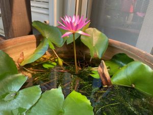 暑すぎる夏ですが、睡蓮鉢に睡蓮、メダカ、水はなんとも涼やかです。