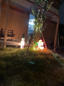 会社のプチお庭にサンタさんとスノーマンの置物をおいてみました。