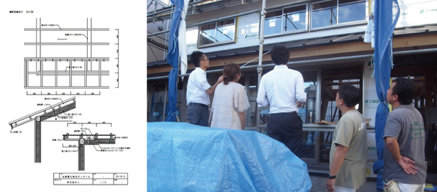 設計施工会議を月一回行っています。社内検査での指摘事項の検討、現場廻りをして継続して使用するディテールを図面化してまとめることや、鉄骨階段、手摺などのディテールを整理して次に生かせるようにしてします。