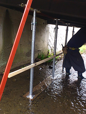 具体的には橋桁の鉄骨にパイプサポート(ジャッキのようなものです。)