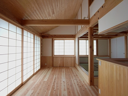 キッチンや1段上げた和室など、どこからでも眺望が楽しめるよう、メインの居間の障子を全開放としています。木製ドアの玄関や杉板張りの階段室など眺望とは反対側の空間も心地良くなるように工夫しています。