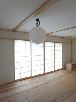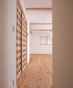 結果、1階の居間・食堂・厨房はシンプルに梁もリズムよく出ています。下屋部分に玄関があり、格子の目隠しを設けてポイントにしています。