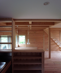 室内も杉板張り、家具は全て大工さんの造作です。木が多いながら、出来るだけスッキリ見えるように気を使いました。