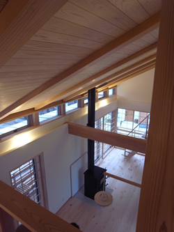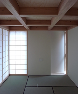 1階の天井は2階の床を表した直天井で、2階は小屋組みの登り梁を910mm間隔で見せて、さらにその間を杉板張りとして迫力を出しています。開口部周りは障子とし、2階では壁内に引き込み障子として、開閉時の使い分けが出来ます。