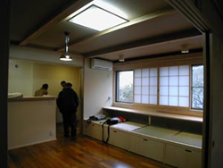 自立運転型・OMソーラーを設置した二世帯住宅です。リビングに設けた小上がりの畳は、書斎兼くつろぎのスペースになります。